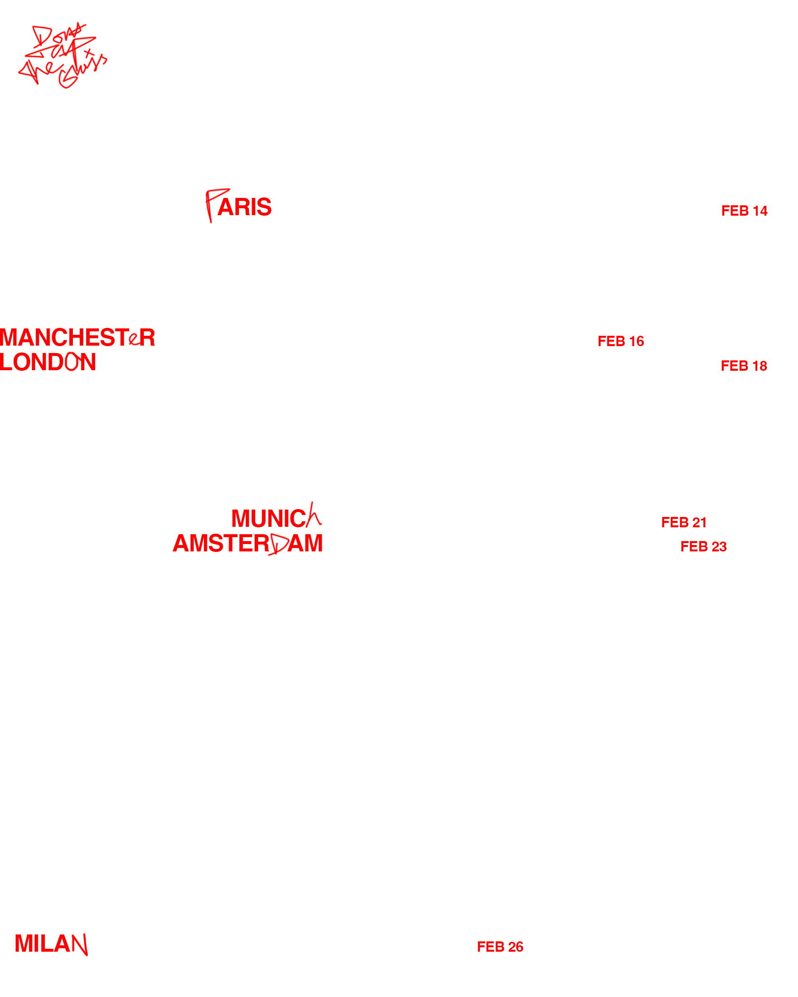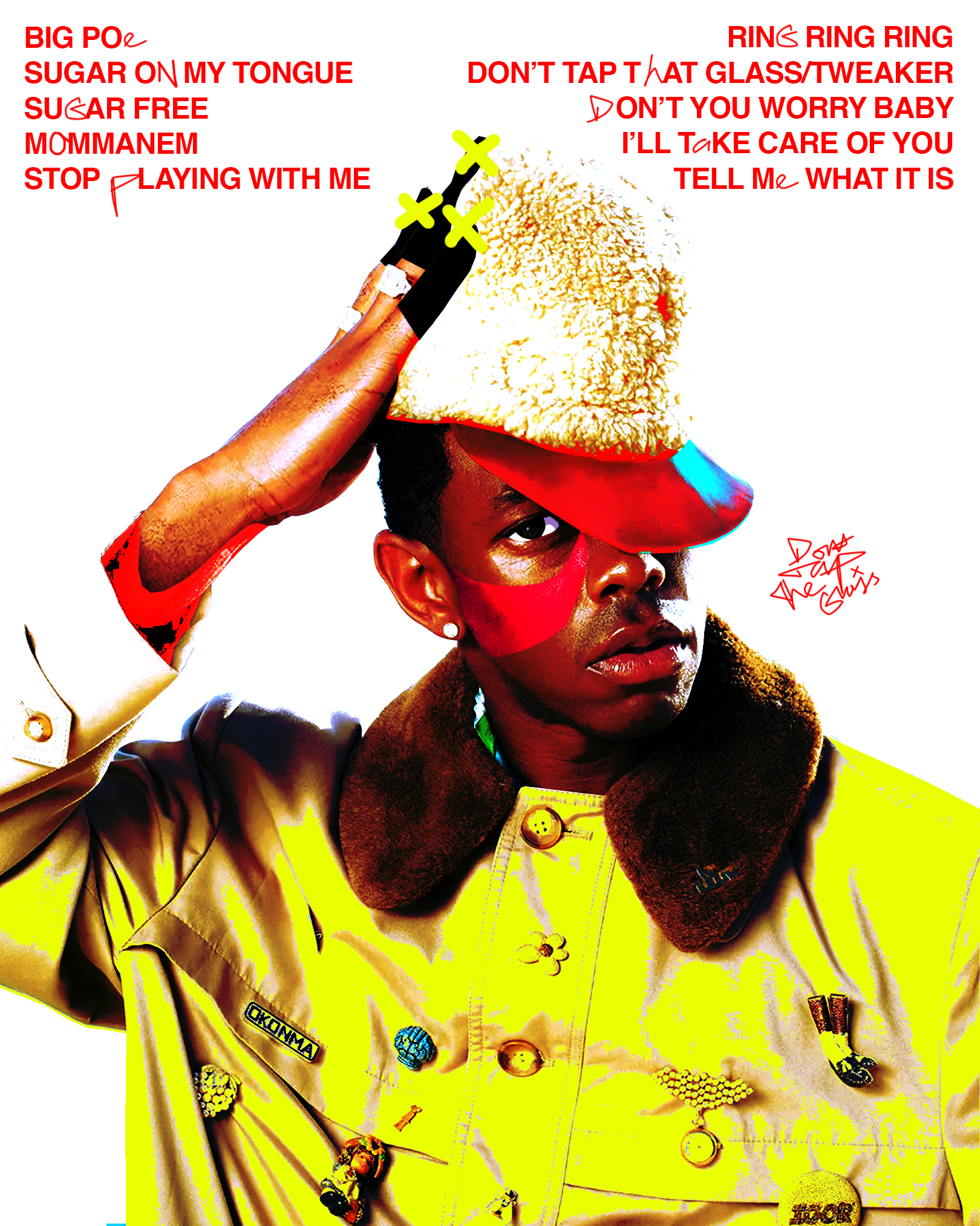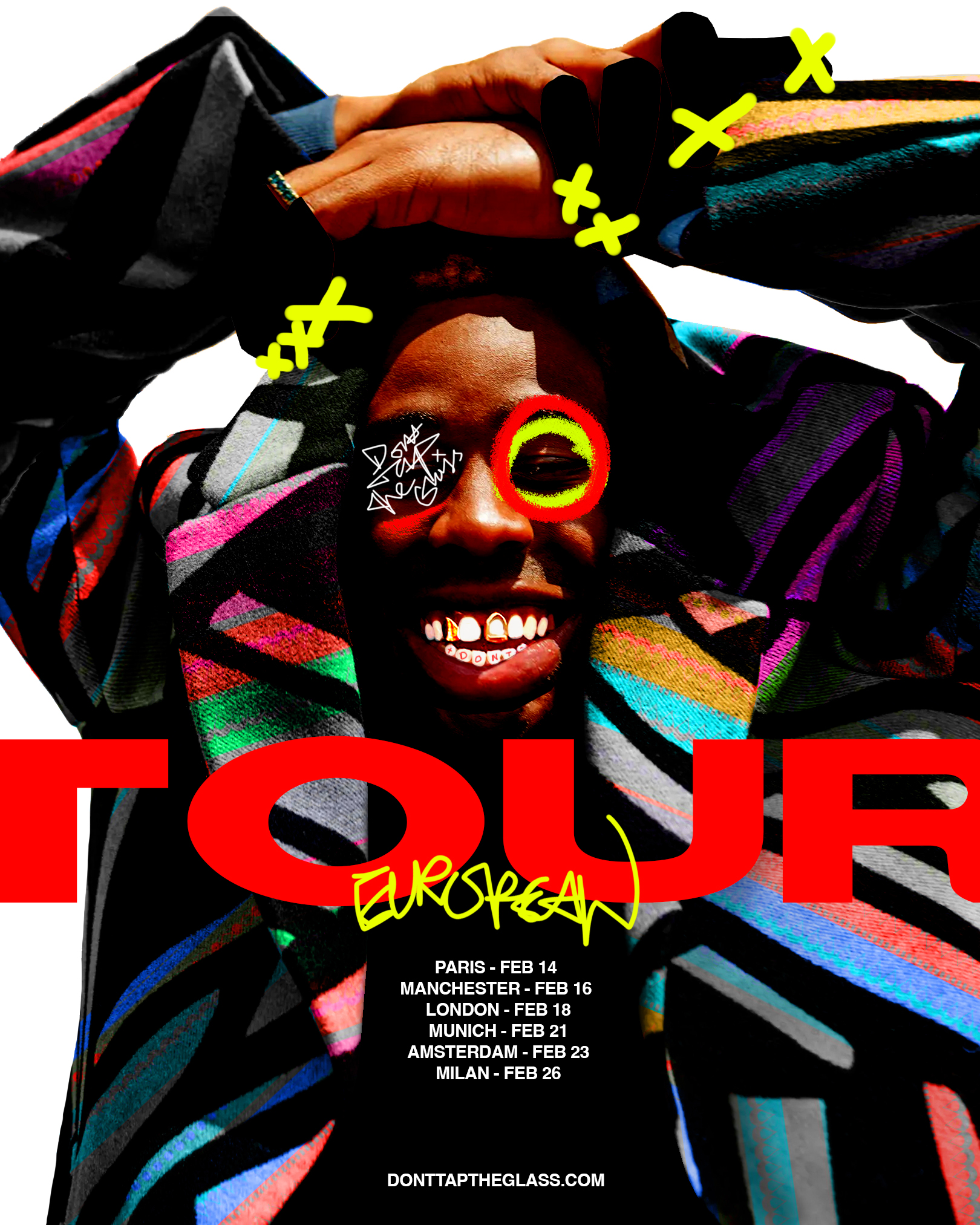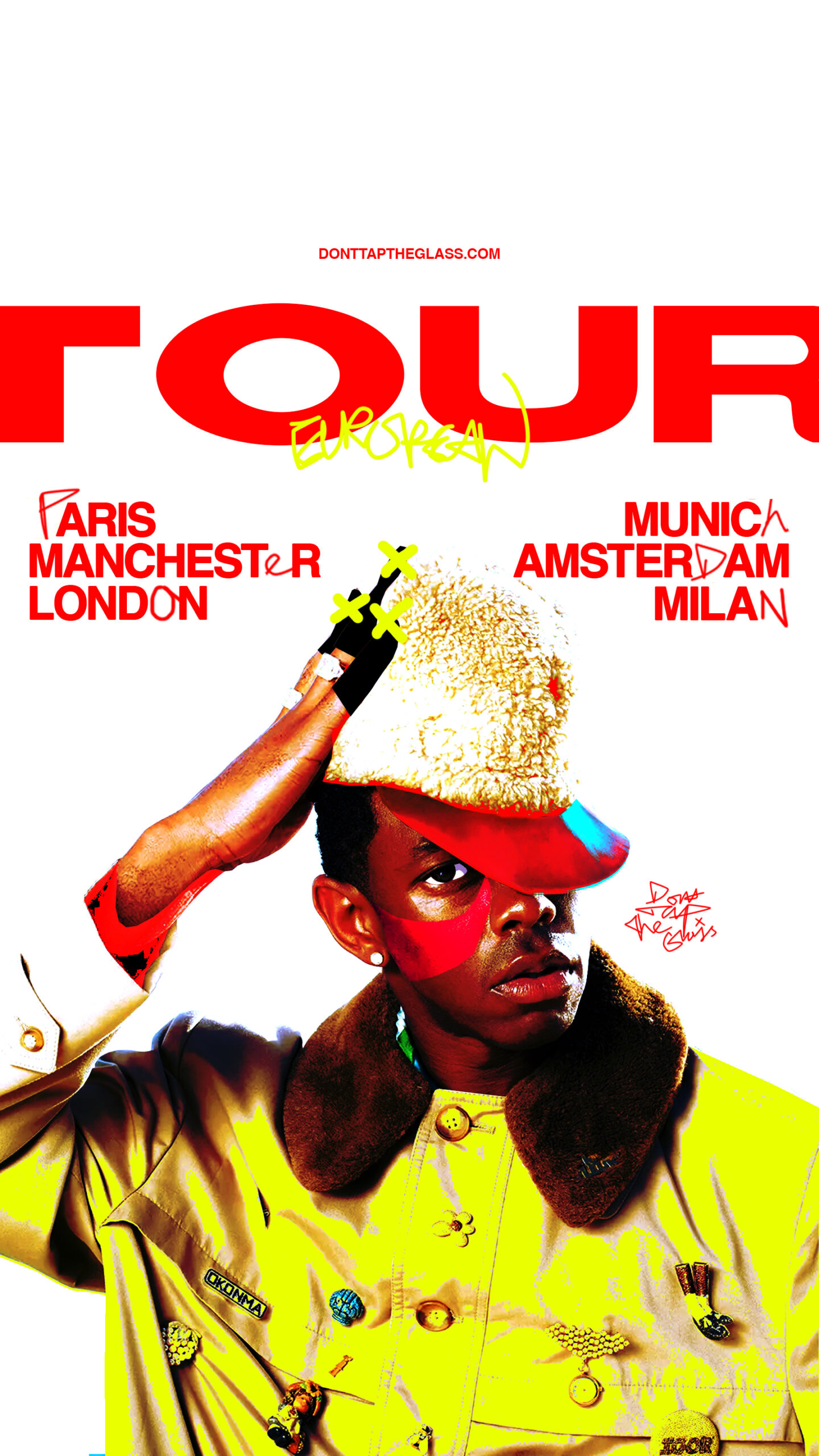 ‘Don’t Tap The Glass – 2026 European Tour’. This is a visual identity for Tyler the Creators Album ‘Don’t Tap The Glass’. I packaged this albums visual identity through the means of a 2026 European Tour. I wanted to produce a tour visual identity which was experimental, fun and truly authentic (resembling the identity and essence of the album).