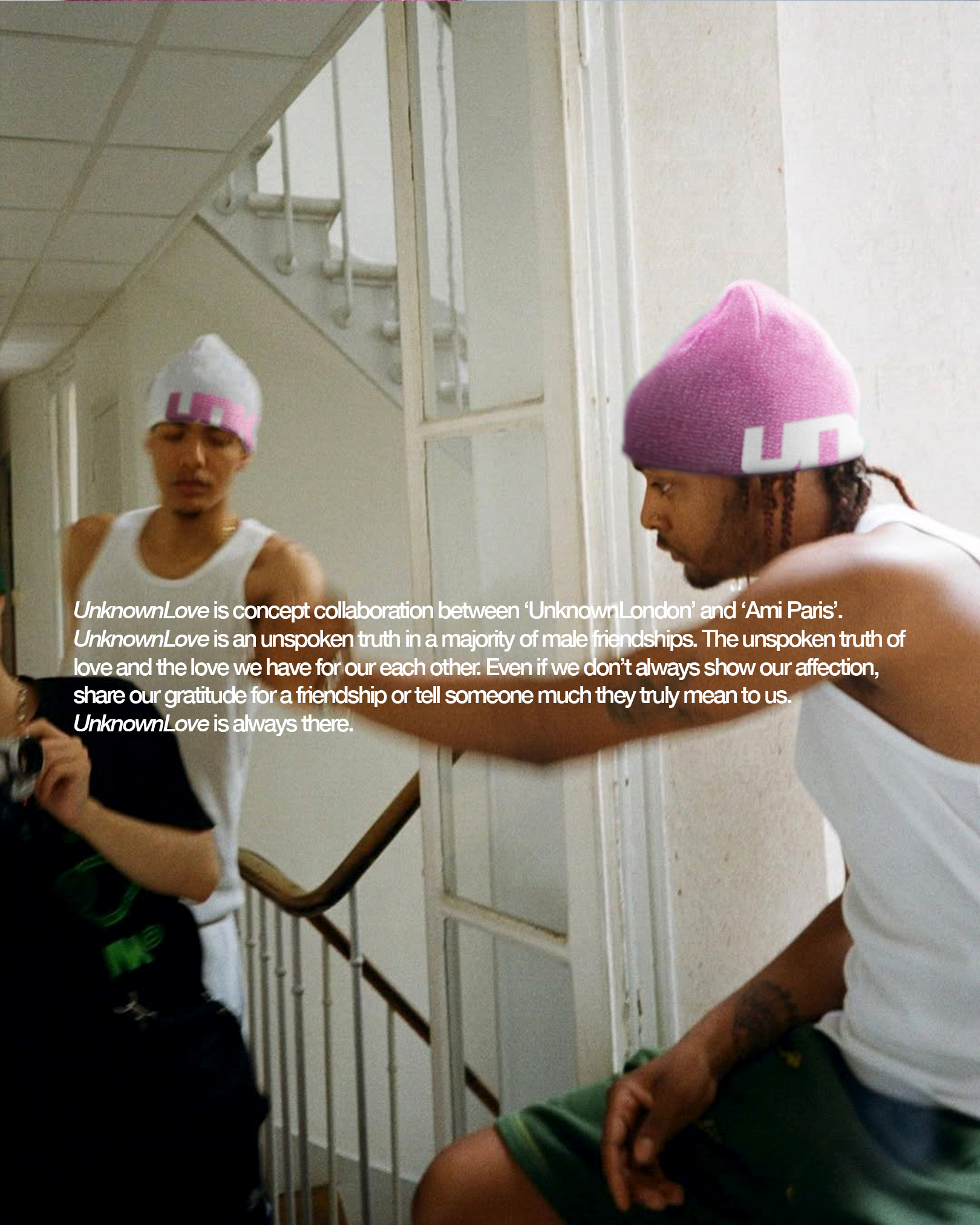 UnknownLove is concept collaboration between ‘UnknownLondon’ and ‘Ami Paris’. UnknownLove is an unspoken truth in a majority of male friendships. The unspoken truth of love and the love we have for our each other. Even if we don’t always show our affection, share our gratitude for a friendship or tell someone much they truly mean to us. UnknownLove is always there.